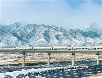 山西省忻州市代县境内,雪后的群山巍峨磅礴,一列复兴号列车在集大原高铁线上飞驰而过。 刘玉才摄(人民视觉)