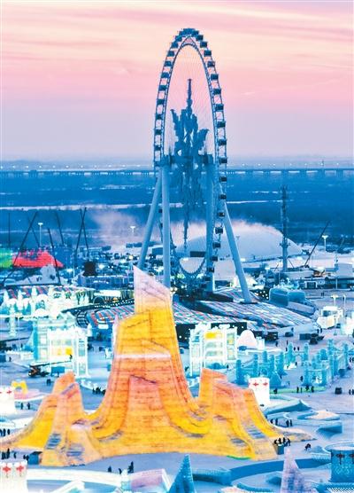 第二十七届哈尔滨冰雪大世界近日在黑龙江省哈尔滨市开园,为来自全国各地的游客打造一场兼具视觉震撼与深度体验的冰雪盛宴。图为傍晚时分的园区风光。 唐守弘摄(人民视觉)