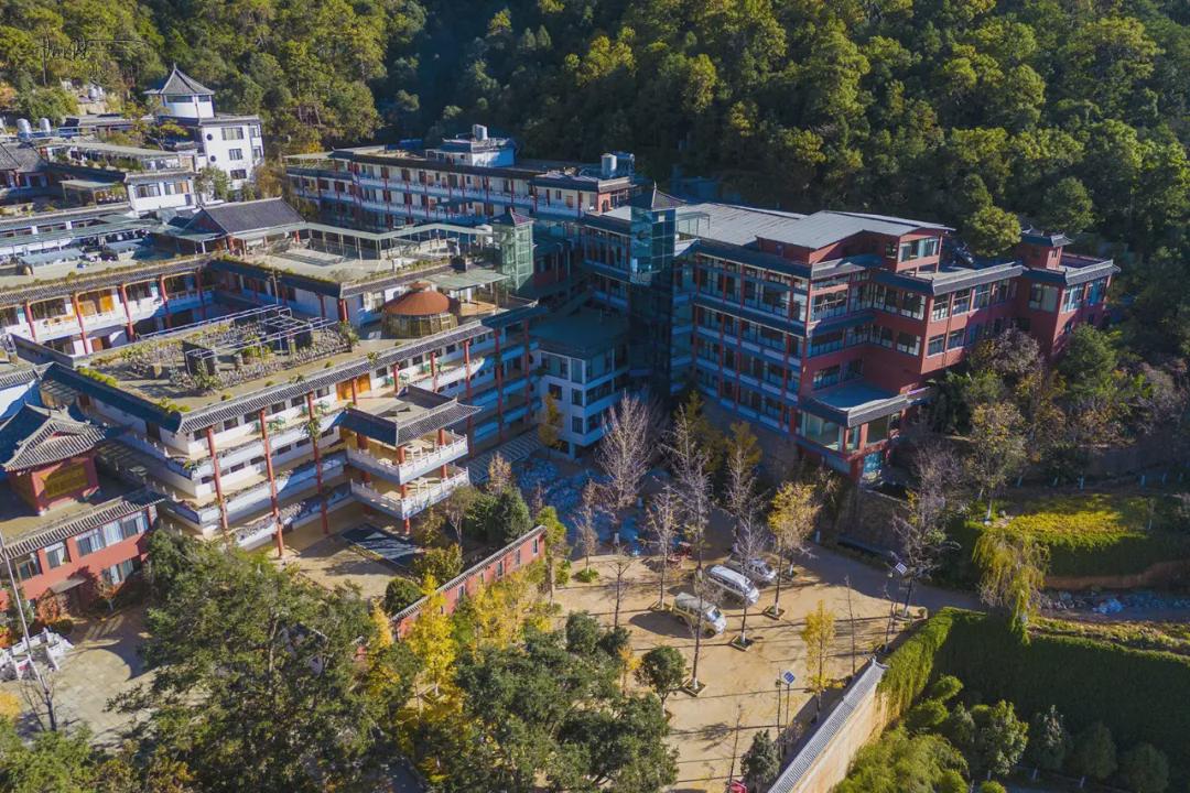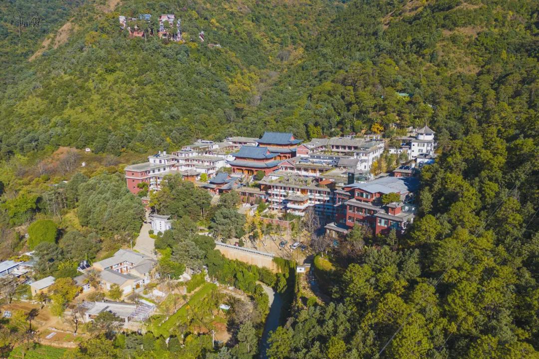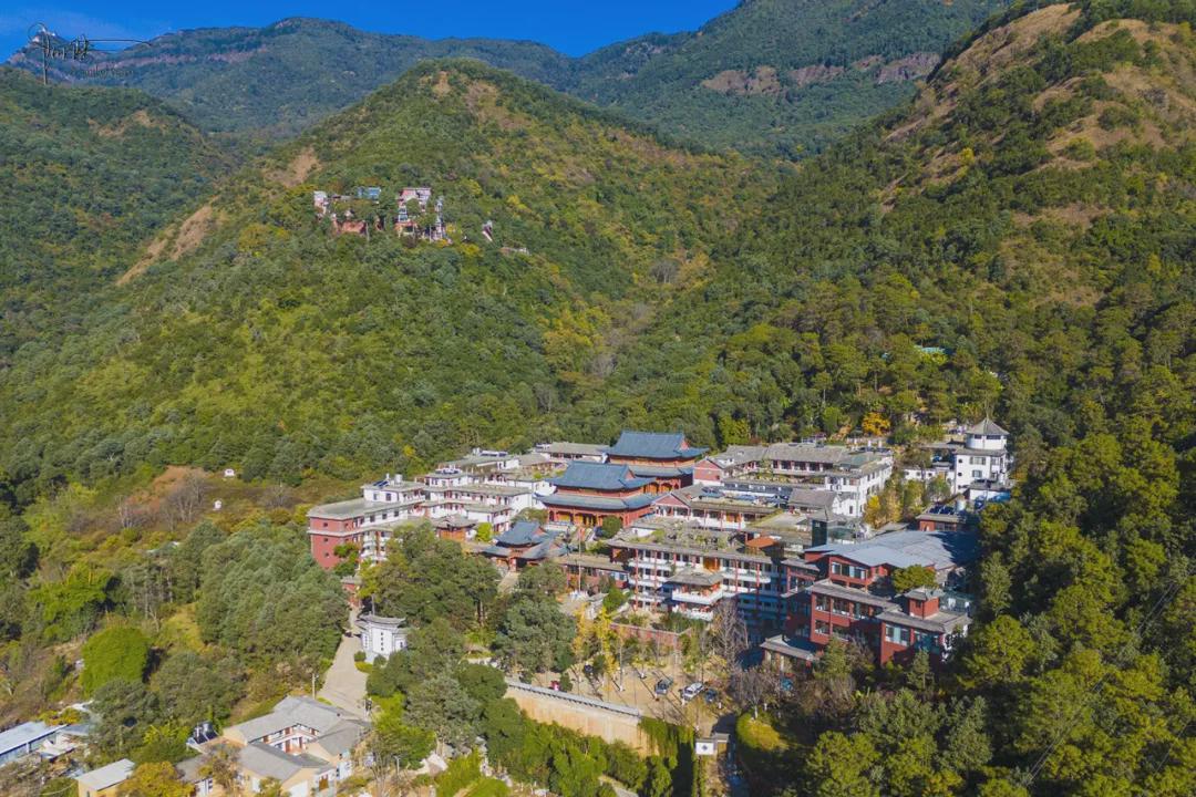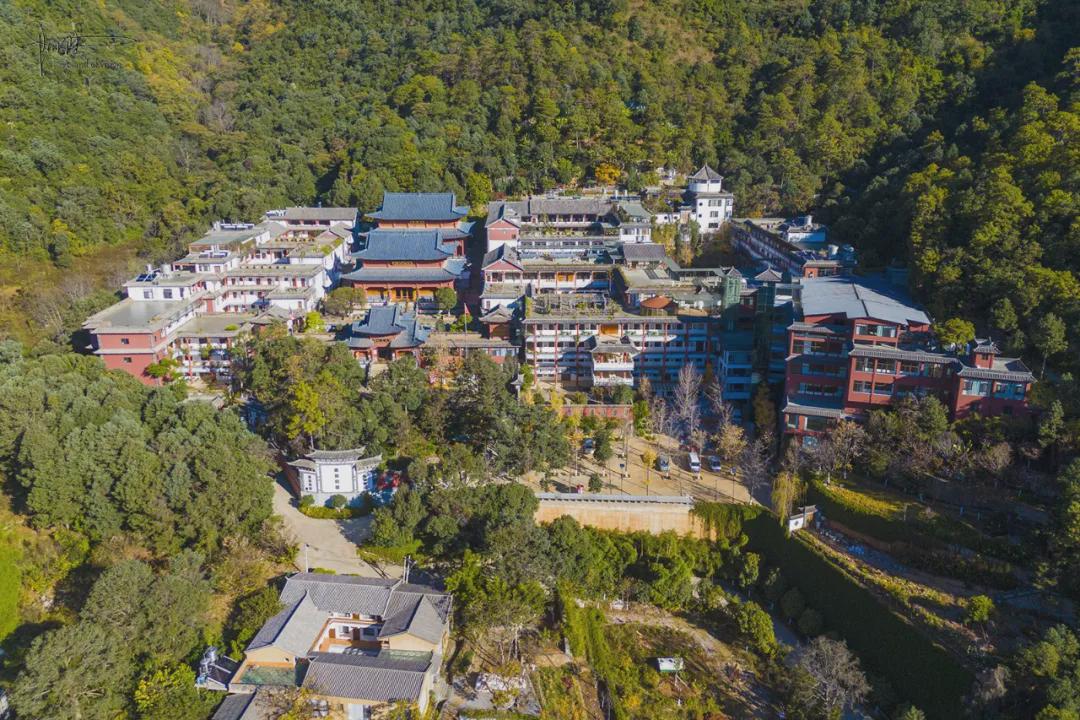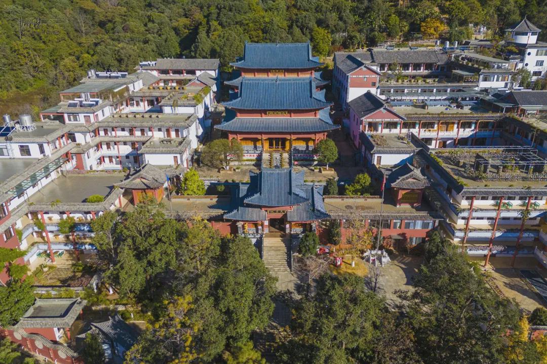 参考相关资料:“寺院整体布局以天王殿、大雄宝殿、三圣殿为中轴线,两侧配有钟楼、鼓楼、观音殿、地藏殿以及客堂、五观堂、讲经楼等建筑,体现了中国传统宫殿建筑艺术与大理白族民居建筑特色的融合”。只是因为这些错落有致的房屋间距实在有限,所以小飞机来回巡航了几圈,竟然一个人也没看着。