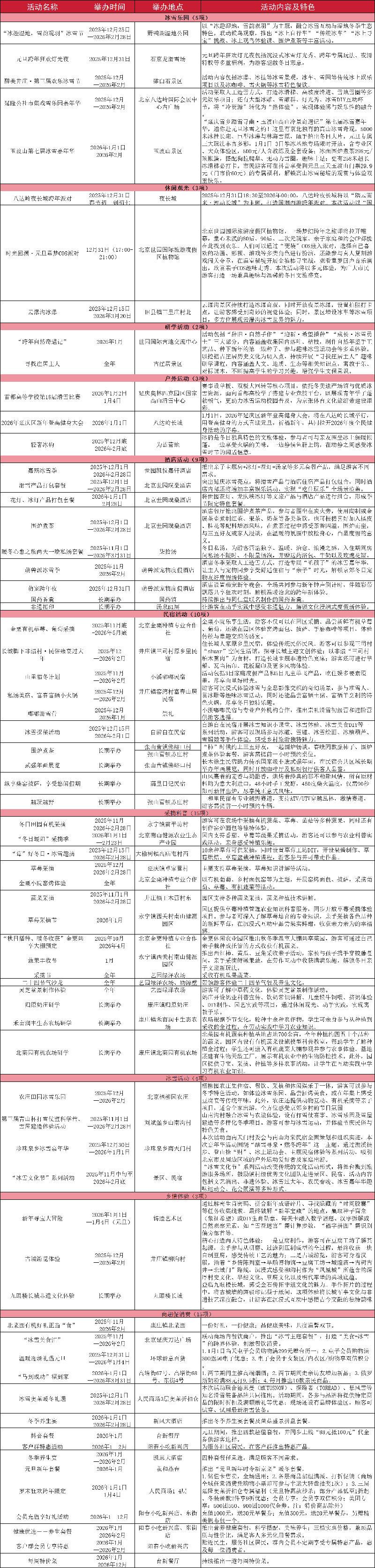 世园为蓝营地轻奢冰钓、世园汤泉体验、石京龙滑雪场滑雪(夜场)、玉渡山冰瀑攀冰、醉美井庄·第三届欢乐冰雪节、永宁古城大集、铸造厂新年寻宝大冒险、北京艺园绿泽农场冬日田园有机采摘等活动,也将满足市民游客多样化的度假需求。