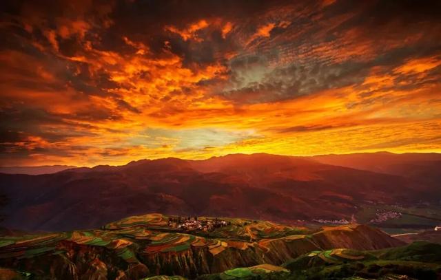 东川红土地落霞沟景区,以其斑斓的色彩而闻名。那一片片红色的土地,在阳光的照耀下,如同燃烧的火焰,热烈而奔放。远远望去,红、黄、绿、白等色彩相互交织,构成了一幅美轮美奂的五彩斑斓图。这里的每一寸土地都充满了生机与活力,让人不禁感叹大自然的鬼斧神工。