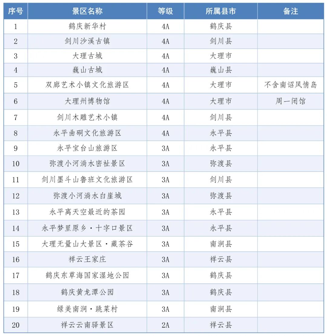 另外,大理州行政辖区内的大理、巍山、剑川三座国家历史文化名城和喜洲、双廊、沙溪等30处历史文化名城(镇村街),以及洱海生态廊道和大部分国家A级景区,对所有游客均免收门票,相关经营性场所按有关规定执行。