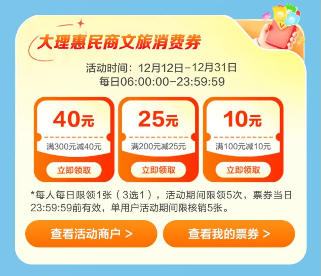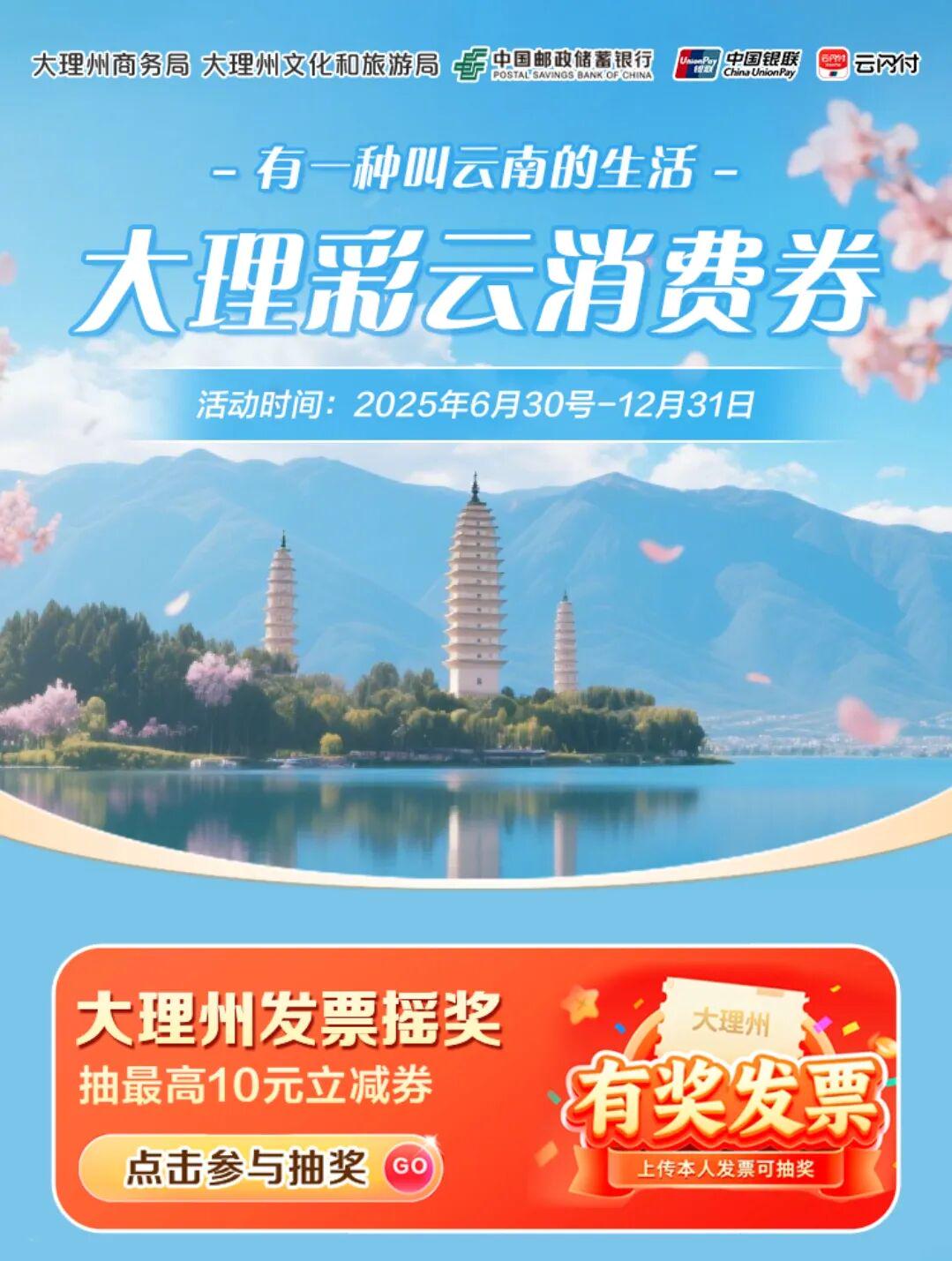 除了大理惠民商文旅消费券外,友友们还可以领取2025年“礼遇滇超”专项消费券、彩云汽车消费券,看滇超、逛古城、游洱海,一路畅玩更省钱。