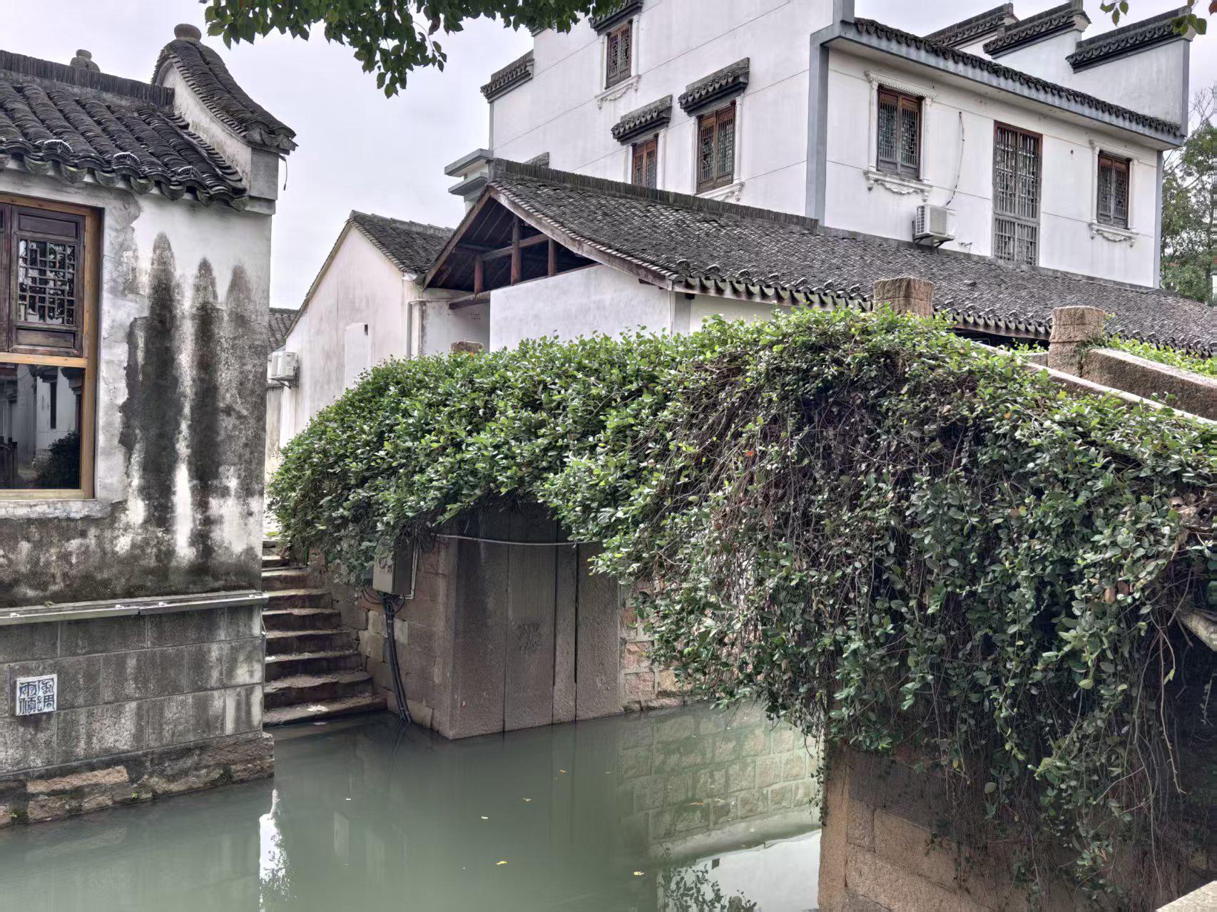 “一条运河千里长,运河两岸是故乡”,荻港村依水而建,沿运河蜿蜒的外巷埭与临河延展的里巷埭一纵一横,昔日商贸往来与居住融合的热闹场景依稀可辨。从高处俯瞰,粉墙黛瓦、廊屋连街,错落有致的建筑群与水道交织,古朴而清新。
