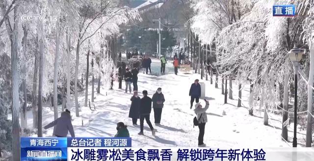 总台记者程河源介绍,漫步在青唐城的雾凇景观街道上,道路两侧的树木被洁白的冰晶层层包裹,玉树琼花、银装素裹,阳光洒落时,反射出斑斓光影。