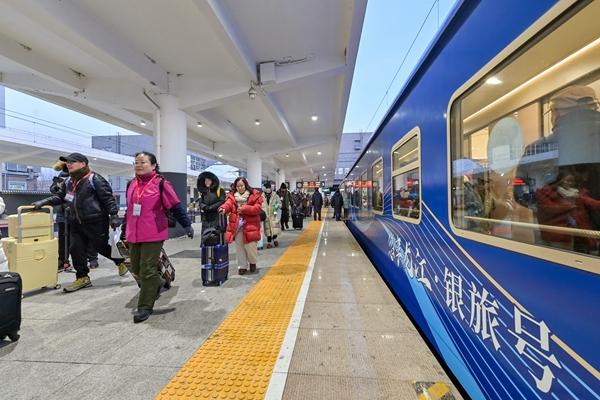 人民网哈尔滨12月28日电 (记者尚城)12月28日7时25分,在哈尔滨开往亚布力的Y999/998次“悠享龙江·银旅号”旅游列车上,来自江苏、浙江、上海等地的240名游客开启跨年冰雪游之旅。这是黑龙江省开行的首趟冰雪环线旅游列车,通过“一站式”服务,将祖国最北端冰雪风情尽收眼底。