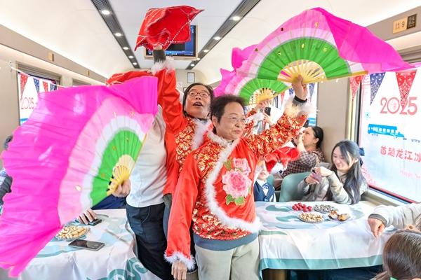 游客将在旅途中迎来2026年的新年曙光,为此,哈铁组建演艺团队在列车上开展互动演出,游客可换装“东北花袄”来一场秧歌体验,也可以体验剪纸技艺。列车上还精心设计“2025—2026”跨年背景墙,供游客打卡留念,让黑龙江冬季旅游从“观光型”向“沉浸型”加速升级。