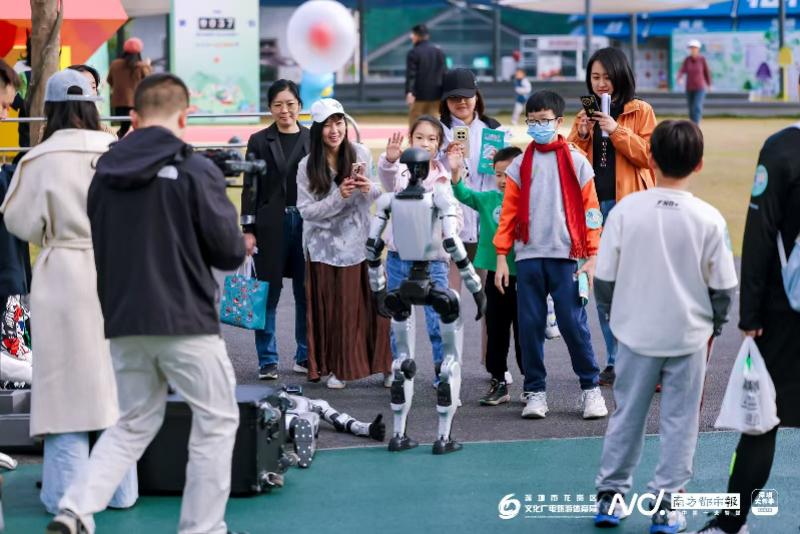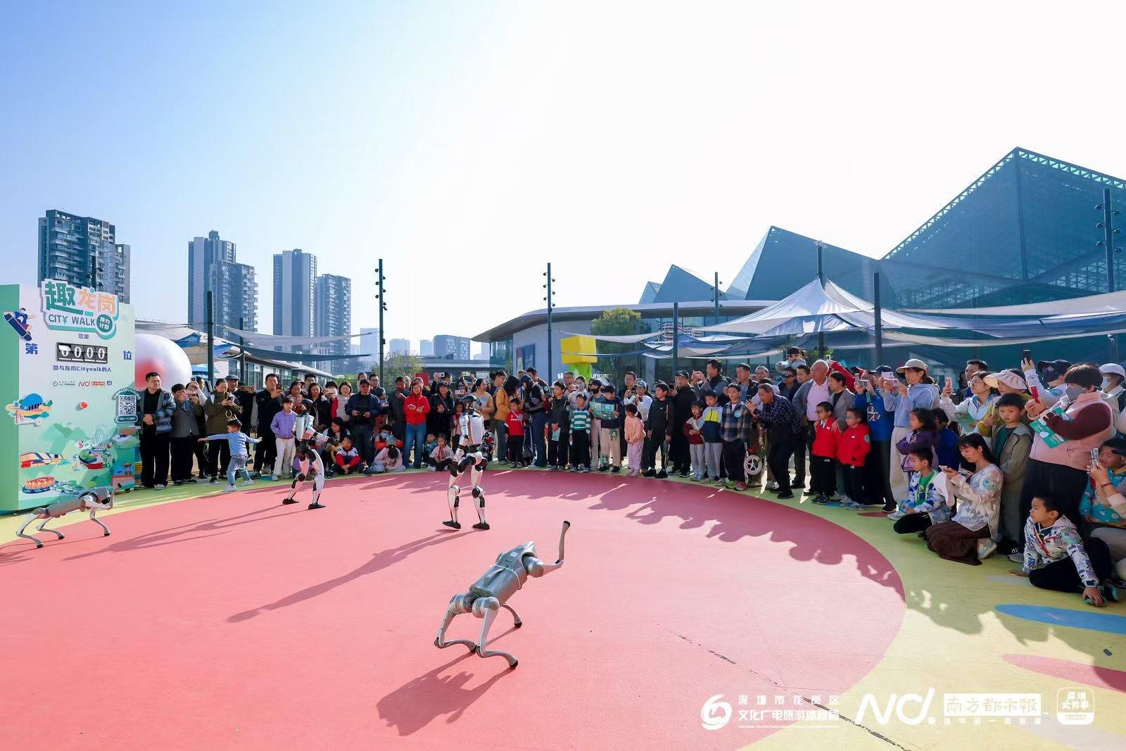 大运天地高地聚场旁,机器“旺财”带来精彩的爬梯挑战赛,人机互动间迸发满满科创活力;开场机器人秀更是瞬间点燃氛围,人形机器人与机器狗携手亮相,既献上精彩表演,更与参与活动的市民和游客近距离互动合影,成为当天最吸睛的打卡点。