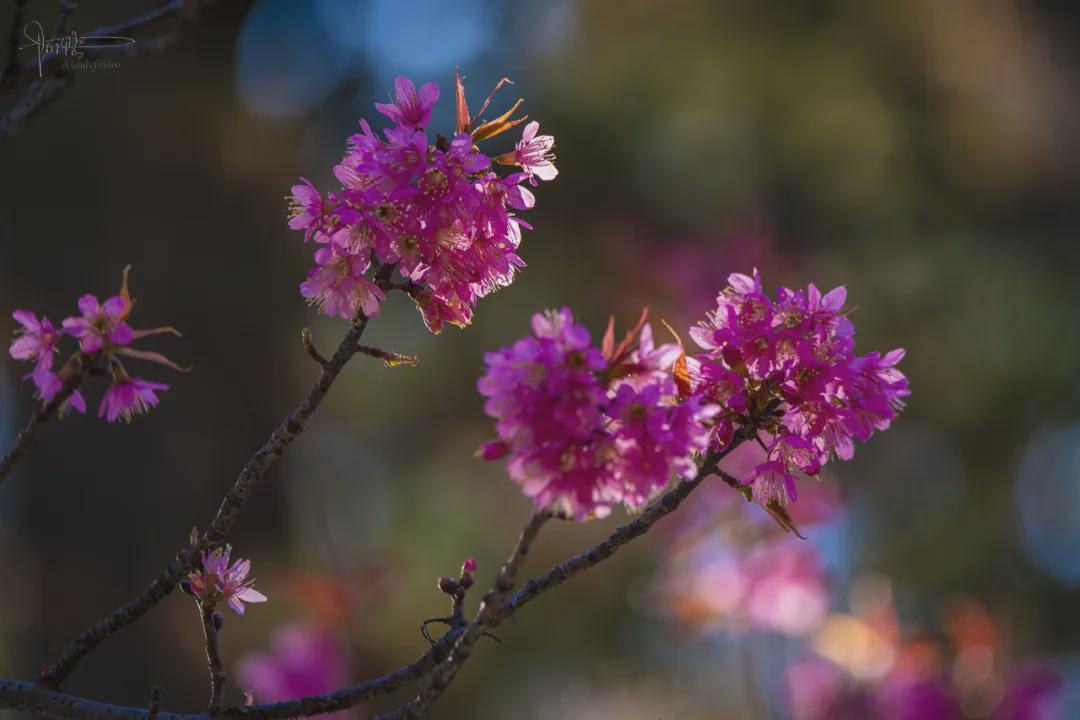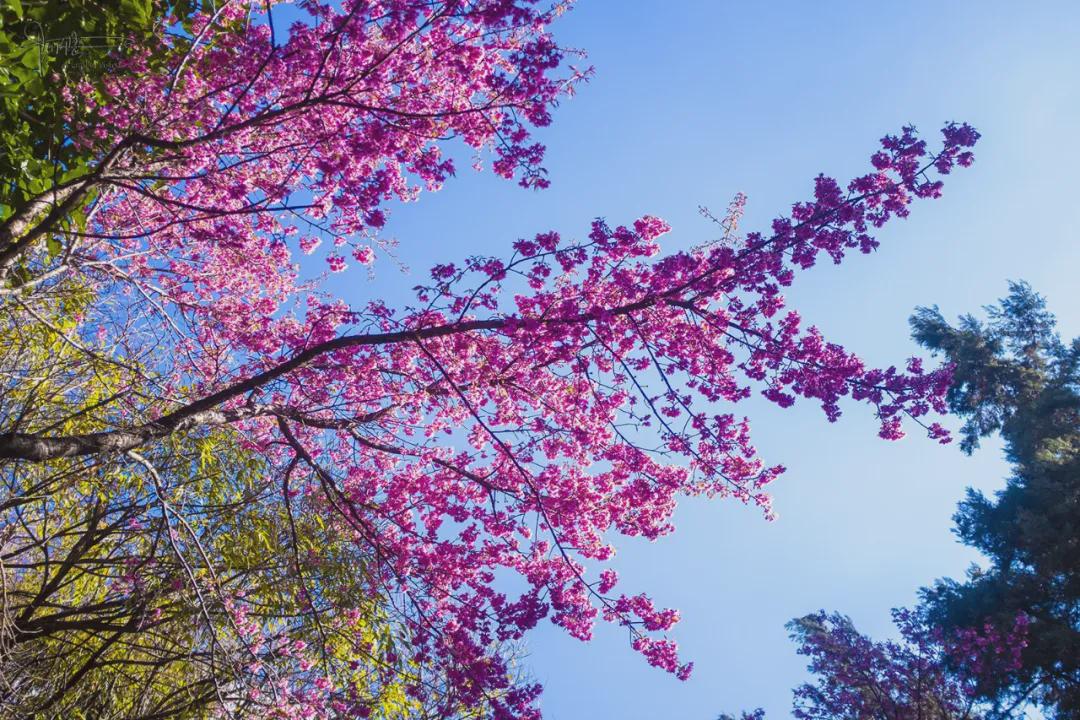 而我们眼前的“冬樱花”还是云南特有的品种,据说“耐寒性较强,花色以浅粉色为主,花朵相对稀疏,但能在冬季营造出独特的浪漫氛围”。它们的盛花期一般是从12月到次年1月,不过也可能会因气候影响有所提前或延后。至于春樱花,自然也是大理的传统樱花品种,其“花枝浓密,花瓣粉红如霞,极富观赏性”。但春樱花的盛花期是从次年3月至4月,显然现在还轮不到它们出场。
