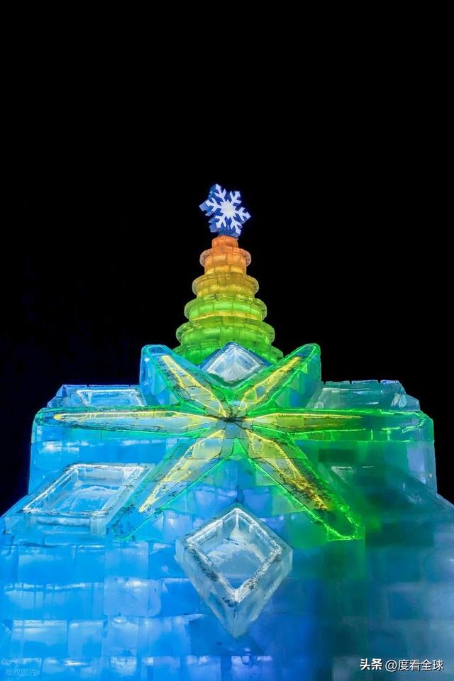 穿过以老哈尔滨火车站为原型的冰筑大门,120万平方米的冰雪世界豁然展开。正午的阳光洒在冰雕群上,折射出细碎的七彩光芒,3.9万立方米冰量打造的主塔“冰灯启梦”矗立在园区中央,雪花托举“山”字的造型在阳光下格外清晰,隐约能看到冰砖拼接的细腻纹路。这是历届冰雪大世界中规模最大的一次,40万立方米的冰与雪,不仅筑就了视觉奇观,更藏着一座城市与冰雪文旅共生的27年进化密码。