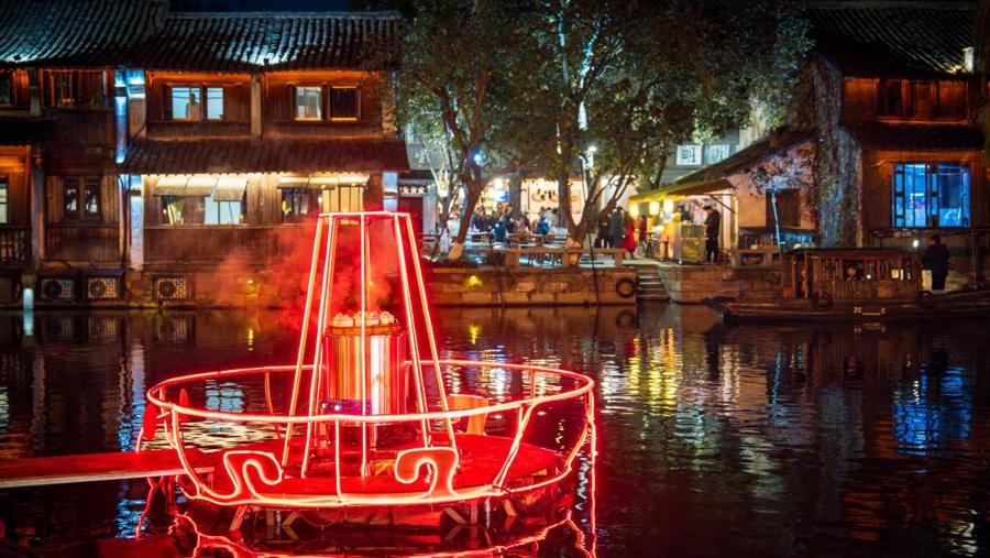 12月31日晚,乌镇景区将上演一场充满仪式感的集体告别。在灵水居码头,中式传统“开锅”仪式后,乌镇特色辞旧全羊礼水上大锅正式沸腾。滚烫的水上大锅散发着阵阵暖意,治愈年终所有的“冷场”,让游客在美食中感受温暖与满足。夜晚,灵水居草坪变身“庆功干杯夜”狂欢现场,设有乐队演绎、朗读会、开放麦等多元环节,在祝福与碰杯中迎接新年的到来。