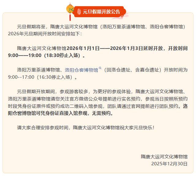 12月30日,记者从洛阳隋唐大运河文化博物馆获悉,博物馆2026年1月1日——2026年1月3日延时开放,开放时间9:00——19:00(18:30停止入场)。洛阳万里茶道博物馆、洛阳仓窖博物馆(回洛仓遗址、含嘉仓遗址)开放时间为9:00--17:00(16:30停止入场)。