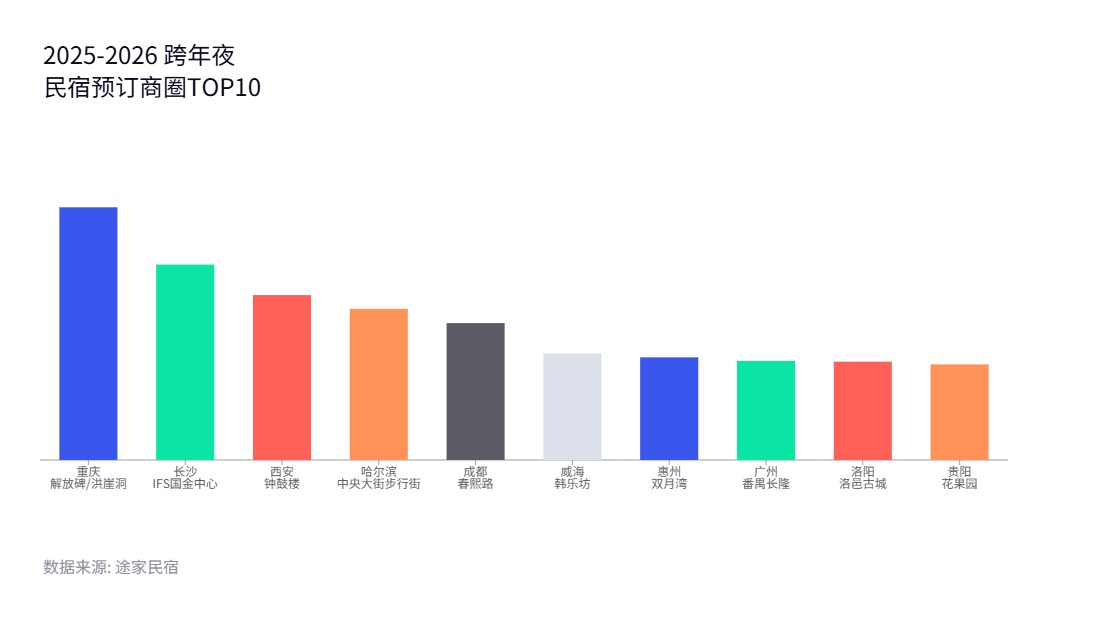 在12月31日跨年夜当晚,重庆解放碑/洪崖洞周边的民宿预订量位列全国商圈第一。长沙五一广场、IFS国金中心,西安钟鼓楼、回民街,哈尔滨中央大街步行街等,也成为跨年夜民宿预订火热的区域。