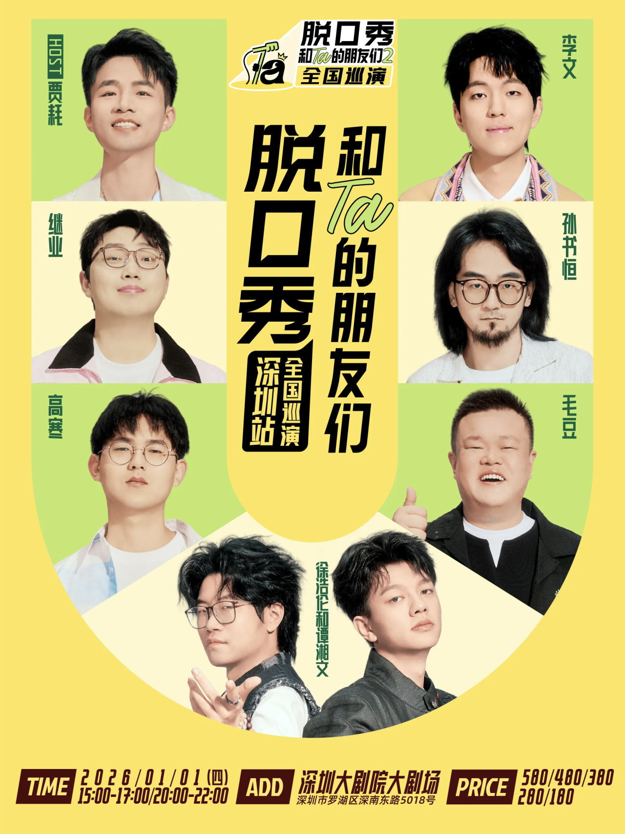 迎2026!深圳跨年必看喜剧盛宴,新年第一天,让笑声点燃2026!《脱口秀和Ta的朋友们2》深圳站,1月1日登陆深圳大剧院啦!超强阵容集结:贾耗爆梗开场、李文搞笑演绎、继业犀利观察、高寒幽默狙击、毛豆惊喜登场、孙书恒脑洞大开、漫才兄弟爆笑组合!7大搞笑高手陪你爆笑跨年,开启全年好心情!