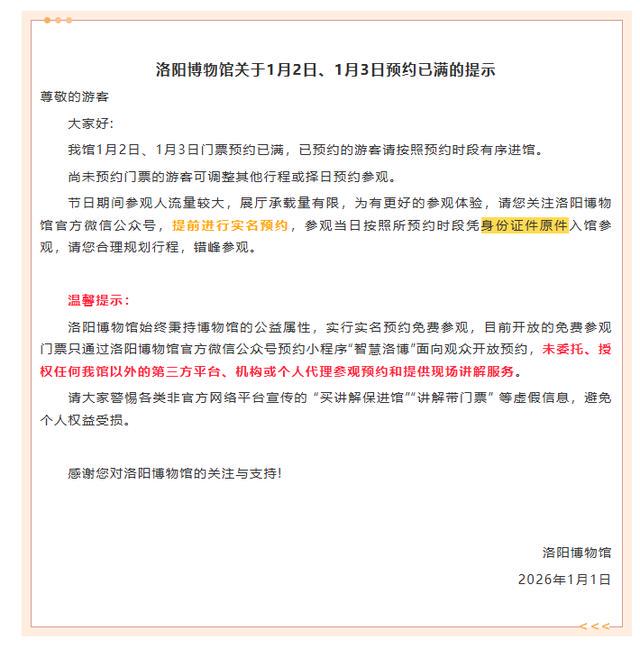 1月1日,记者从洛阳博物馆获悉,该馆1月1日(此前公布)、1月2日、1月3日门票预约已满,已预约的游客请按照预约时段有序进馆。尚未预约门票的游客可调整其他行程或择日预约参观。