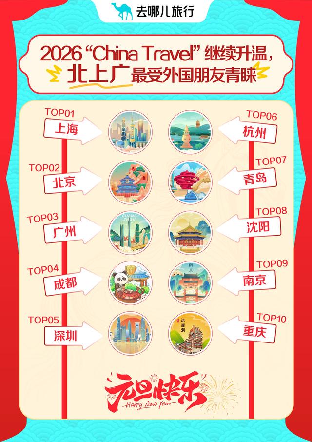 “China Travel”仍在升温,今年,更多外国游客选择来中国迎接新年,1月1日入境游机票量同比增2成。入境目的地方面,TOP10城市是:上海、北京、广州、成都、深圳、杭州、青岛、沈阳、南京、重庆。增速最高的城市除了三亚和海口外,昆明、宁波、郑州、厦门、武汉、长春、广州的增幅超过1倍,成都、南京、西安、天津、深圳增长超过50%。