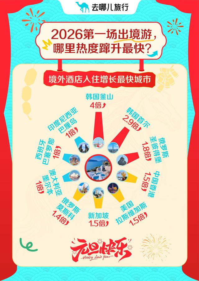 1月1日,2026年首场出境游热潮正式迎来峰值。去哪儿旅行数据显示,选择2026元旦第一天出境的人明显多于2025年同期。新年首日,中国游客将飞往全球475个城市,入住境外821个城市的酒店,飞往热门国家游客量同比增长四成以上。
