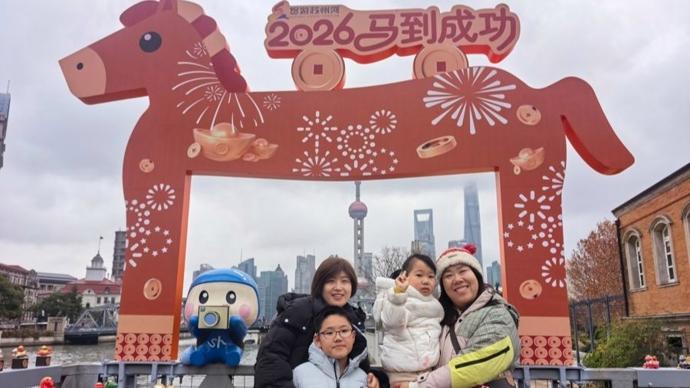 这一特色航班特邀全能音乐人程程献唱,精选多首迎新金曲带领乘客大合唱,航线途经外白渡桥、上海邮政博物馆、四行仓库等标志性点位,游客可伴着旋律尽赏两岸历史风貌与现代景致。虽是阴雨天气且气温偏低,市民游客仍游兴不减。家住苏州河边的冯先生一家四口专程选在元旦登船,换个水上视角感受家门口的河景;来自青浦的丁皓然小朋友是第二次乘坐苏州河游船,他特别喜欢新年乘坐的这艘游船超大的玻璃窗,因为“可以在船上更好地看风景”。不少游客下船后还在码头马年主题装置前驻足打卡,拍下温馨全家福。