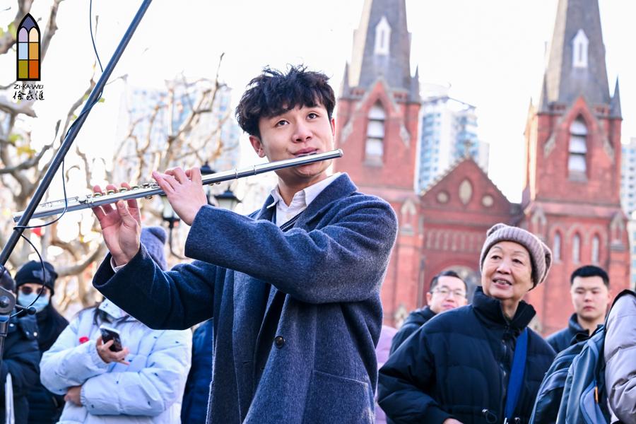 元旦假期的第二天,阳光晴好,午后的徐家汇公园里,不少游客来休闲、拍照。下午1时30分,从百代小楼传来的《梁祝》乐曲声吸引了大家的注意,“快看,阳台上有人在拉小提琴!”随着几声惊呼,市民们反应过来,一场以百代唱片公司旧址为舞台的音乐快闪正在上演。3时30分,快闪又来到了徐家汇书院,将古典与流行风格混搭、让民族与西洋旋律碰撞,让广场化身音符的海洋,为这场“徐家汇源·都市交响”快闪画上圆满句号。