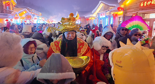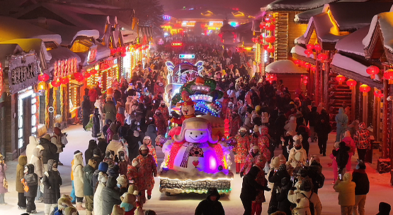 人气爆棚的花车巡游惊艳亮相,憨态可掬的“大冻梨”“狍子”人偶沿途派送荧光棒、拍手棒等礼物,伴随着《过年啦》《春节序曲》《我和我的祖国》等欢快旋律,氛围感直接拉满。