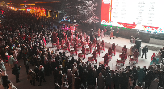傍晚时分,雪韵大街迎来首轮狂欢高潮。舞狮、高跷民俗表演霸气开场,金狮腾跃、高跷翻飞,锣鼓声中尽显传统年俗的独特魅力;秧歌、腰鼓队沿街巡游,火红的绸带与雪白的世界相映成趣,《东北大秧歌曲》《腰鼓鼓点曲》的欢快节奏,勾勒出一幅热闹非凡的冬日画卷。