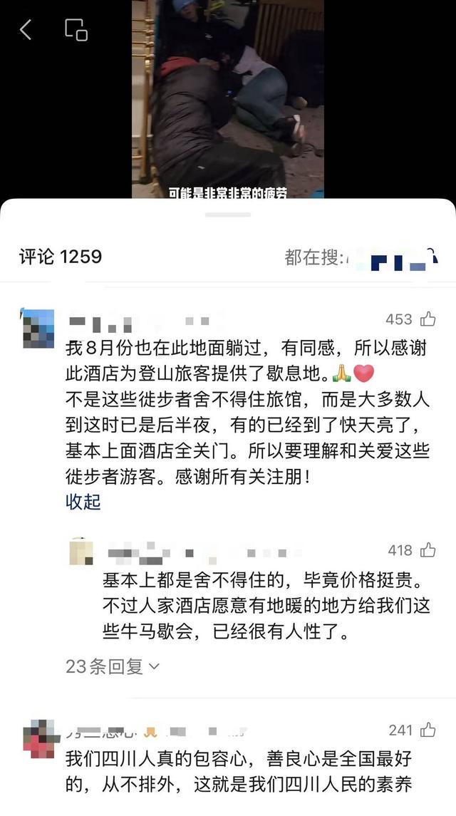 随后,有网友留言分析,是游客太多导致拥堵,提醒大家错峰到峨眉山游玩。还有游客发布山顶酒店大堂的相片,称有游客被困山上,挤在酒店大堂过夜。
