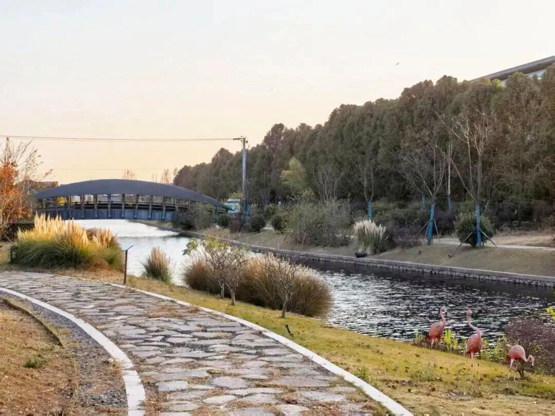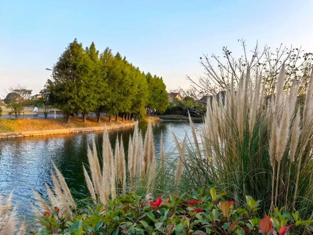 经精心修植,两岸四季如画。春有垂丝海棠与毛鹃黄菖蒲共舞,夏见紫娇花同金鸡菊争艳,秋观狼尾草伴千屈菜摇曳,冬赏蜡梅映红叶石楠傲立。细芒草等原生植物与新添的柳枝稷、花叶芦竹相映成趣,2400平方米绿化织就“全年常绿、四季有景”的生态锦缎。