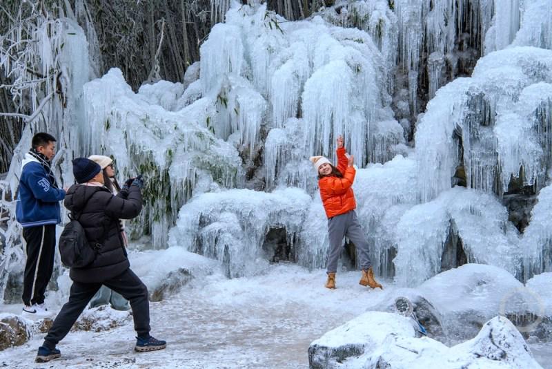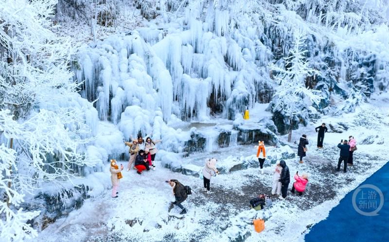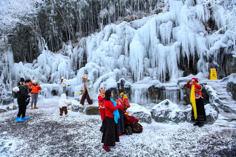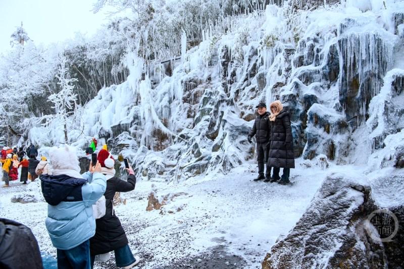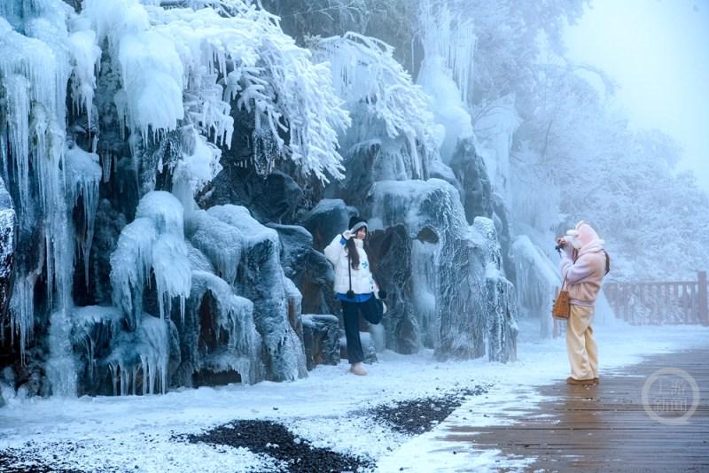 1月5日,受寒潮低温天气影响,重庆市南川区金佛山景区在海拔2100米的观霞台处,形成了形态各异的百米冰瀑群。晶莹剔透的冰凌与霜冻景观,吸引了众多游客前来拍照打卡,仿佛置身童话冰雪世界。