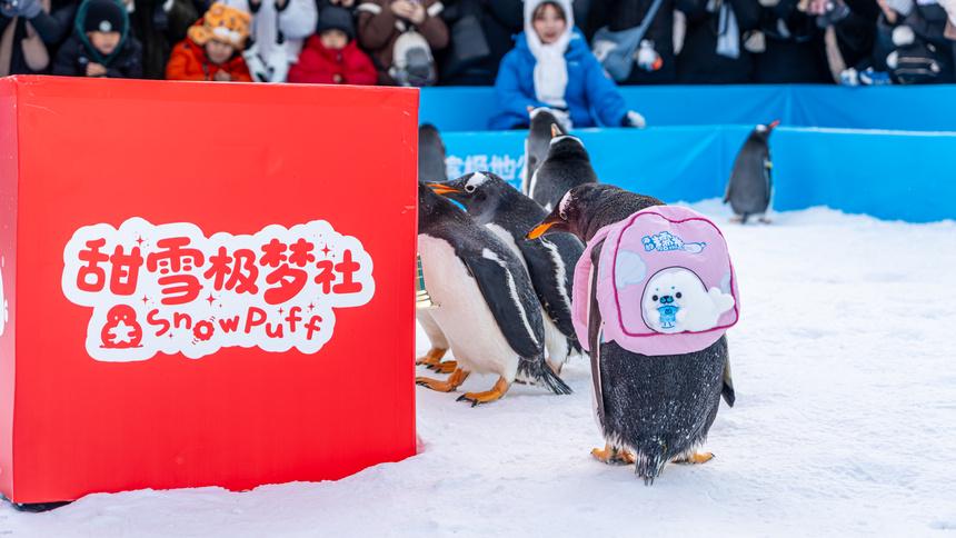 在全国游客的见证下,哈尔滨极地公园原创全新冰雪文旅IP“甜雪极梦社”(SnowPuff)在哈尔滨与杭州两地同步首发。在哈尔滨极地公园首发仪式现场,特别迎来企鹅家族新成员“甜雪”与“糯米”——它们分别身背黄色与粉色小书包,作为全新冰雪文旅IP“甜雪极梦社”的“代言鹅”加入企鹅巡游天团,以更生动的方式贴近游客,传递冰雪文化的温暖与活力。