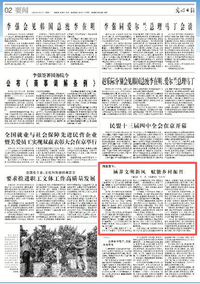今日出版的《光明日报 》刊发《河南西平:涵养文明新风 赋能乡村振兴》。