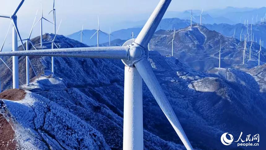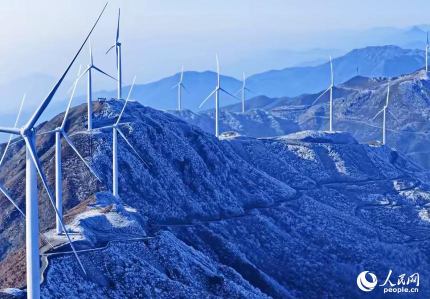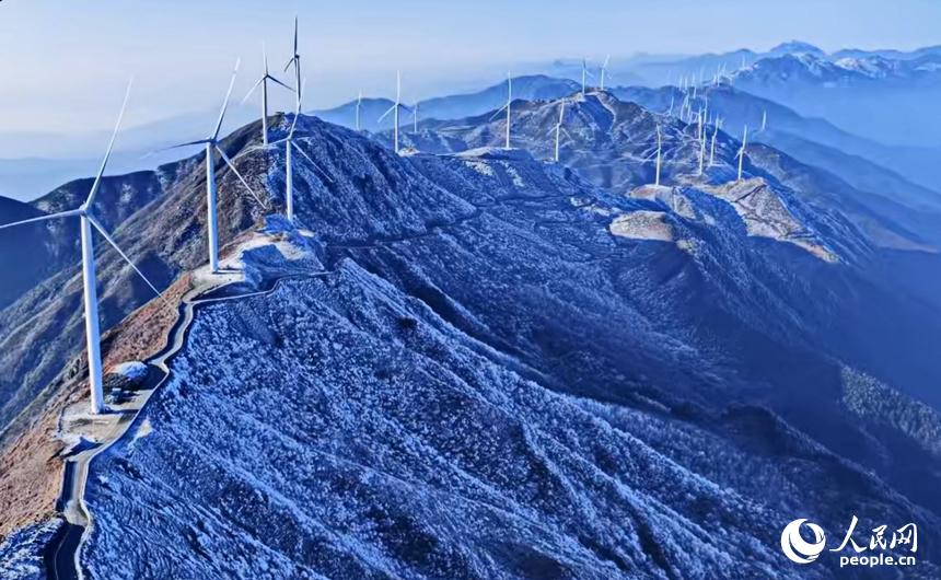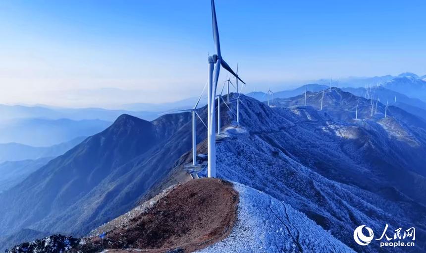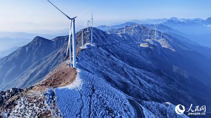 人民网上犹1月7日电 (记者朱海鹏)近日,江西省赣州市上犹县双溪乡草上的风力发电场,一台台风力发电机矗立在山巅,与蓝天白云、蜿蜒群山、皑皑白雪相映成景,构成一幅冬日高山冰雪美景。