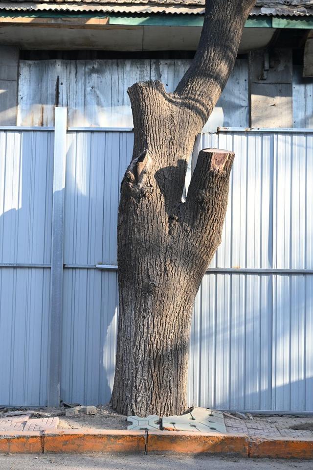 据北青报记者实地了解,长辛店老镇现有6株挂牌古树,分布于院落深处或胡同僻静处,这些古树除悬挂北京市园林绿化局2017年统一制发的标识外,更享有“一树一策”的养护待遇,具体措施包括封填树洞、拉纤加固、钢管支撑、修筑围栏等。相比之下,普通行道树则未能获得同等保护,部分大树还存在拴绳、缠绕铁丝等人为干扰现象。位于大院口东口外一株胸径达65厘米的国槐,其两根主枝已被截断,树形受到明显影响。
