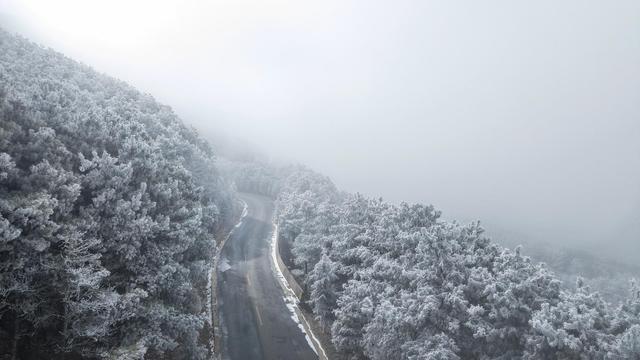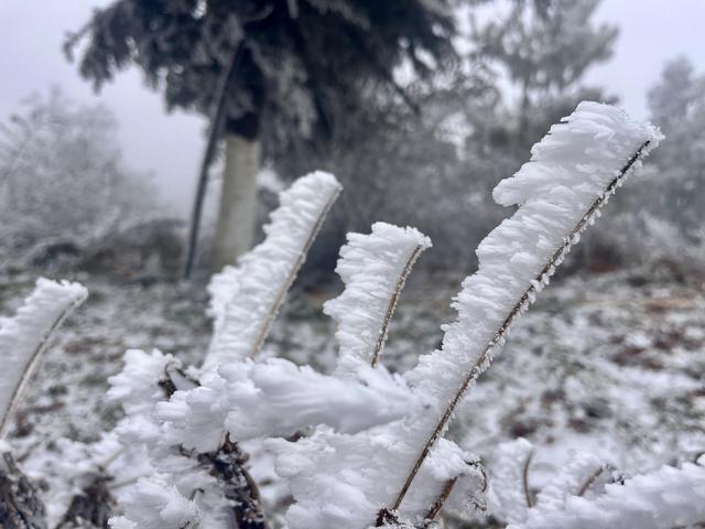 在低温与充足水汽的共同作用下,漫山遍野更形成了令人惊叹的雾凇奇观。草木枝条上凝结出厚达2厘米至3厘米的白色冰晶——松针变成毛茸茸的银丝,灌木丛化作海底的珊瑚,就连枯萎的蕨类植物也被冰晶重新赋予形态,在逆光中透出琥珀般的光泽。随着阳光逐渐强烈,整片山林熠熠生辉,呈现绝美雾凇景象。