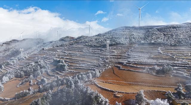 站在乌蒙之巅远眺,连绵的峰峦尽披银装。墨绿的冷杉、笔直的云南松,每一根枝条都被晶莹剔透的冰凌包裹,在晨光中闪烁着钻石般的光芒。山谷间未散的薄雾轻轻流动,与玉树琼枝相互掩映,宛如一幅徐徐展开的水墨丹青。山风拂过,枝头的冰晶轻轻碰撞,发出风铃般的清脆声响。