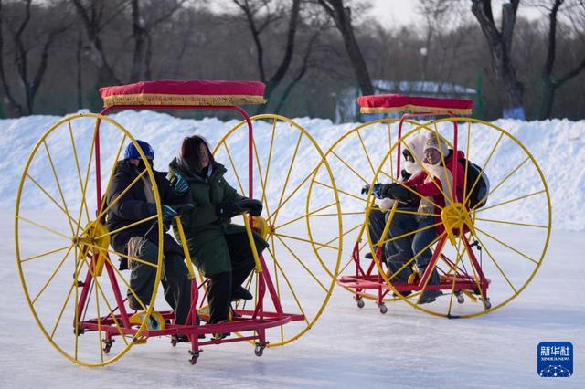 1月8日,游客在太阳岛雪博会园区体验冰雪娱乐项目。