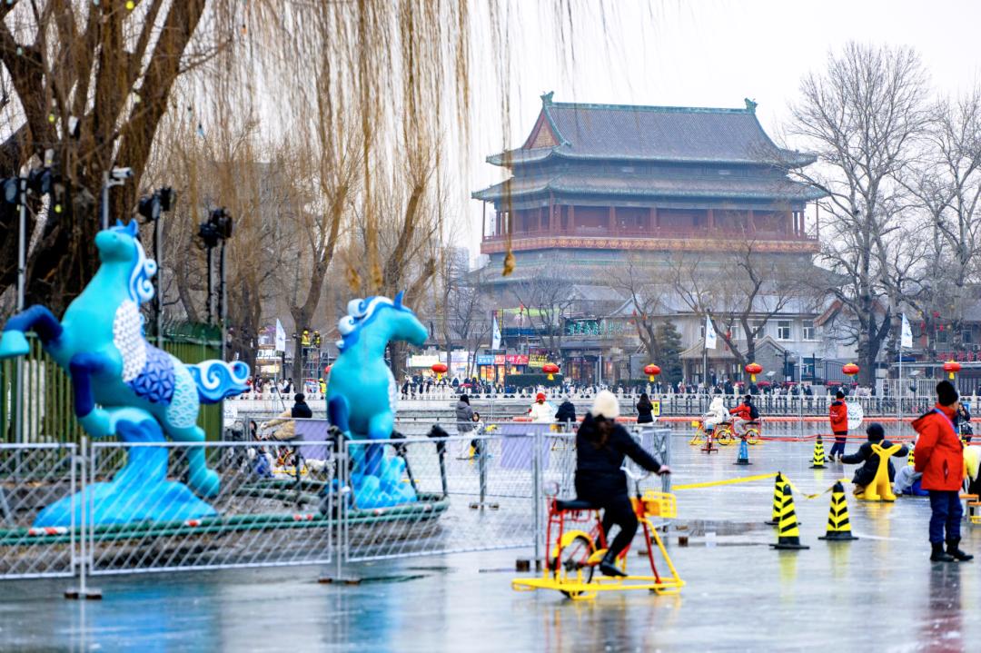 今年什刹海冰雪嘉年华以“飞马踏冰”为主题,冰场入口及围栏处的道旗、灯笼等均巧妙融入马年元素,冰面上更设置了灵动的蓝色飞马雕塑,方便游客打卡,随手一拍便可获得与冰面、骏马、鼓楼、蓝天同框的大片。