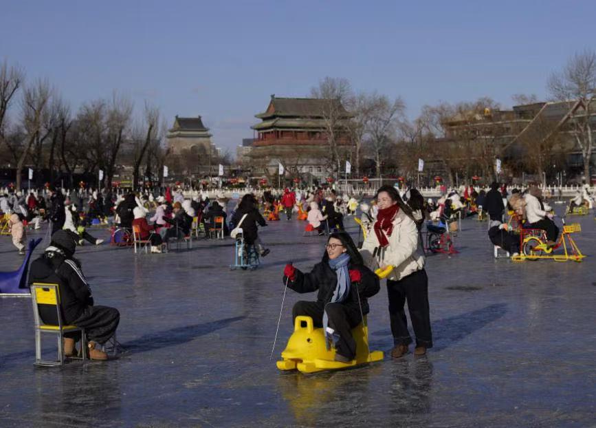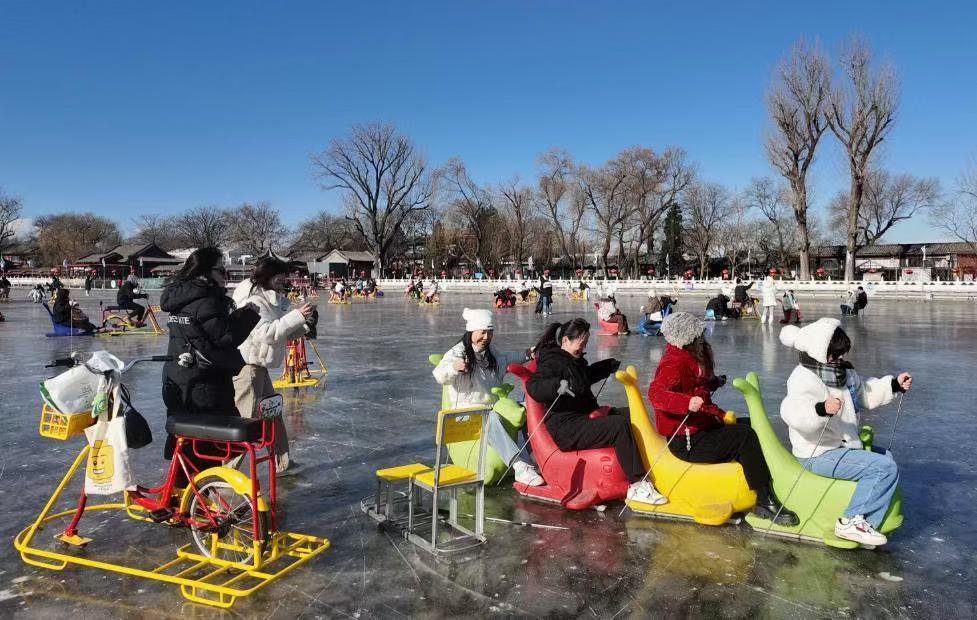随着阵阵欢声笑语,记者注意到,一群穿着亮色羽绒服的孩子挑选好心仪的冰车,便迫不及待的追赶着冲向冰场中央。在冰场的另一侧,也有游客驾着冰车靠近灵动的蓝色飞马雕塑,拍下与冰面、骏马、鼓楼同框的大片,将京城地标与冬日里的欢乐同框定格。
