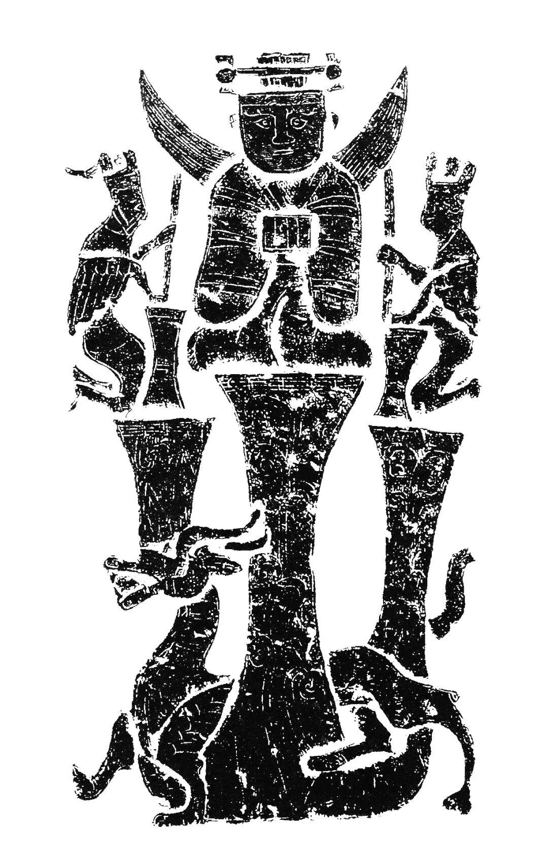 西汉初期,西王母成为本土信仰中的大神,并与昆仑山高度捆绑,难以分割。山东沂南北寨的一幅汉画像中,昆仑山的形象呈现为三根立柱,中部稍细,上下稍粗,并饰有线刻的植物纹样,三柱底部相连,组成一个巨大的“山”字,有一头双角的神兽跨在山字中间,这里的昆仑山并非具象的山体,而是高度抽象为符号,三根立柱的稳定性结构,迥然超出大地之上,是高山,同时也是天柱,令人一望即知其崇高属性。在山顶的平台上,居中坐着的便是西王母,方形面孔,肩后生出了双翼,左右两边各有一个带翅膀的羽人在捣药,或即传说中的不死药。《淮南子》载:“羿请不死之药于西王母,姮娥窃以奔月。”不死药的故事经过传播,西王母便成为生死的主宰,地位一度尊崇无比,在汉画像里频频出现。