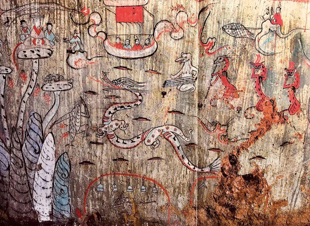 陕西郝滩汉墓壁画《拜谒西王母乐舞图》,提供了一种更具浪漫色彩的昆仑图式,画面左侧的昆仑山,是由高耸的群山和灵芝草组成的,山峰上有曲线的波浪纹,山石之间发出三朵灵芝,姿态轻捷飘逸。灵芝是传说中的仙药,《神农本草经》认为“久食轻身不老,延年神仙”,故而灵芝充当了仙山的符号,汉画像中也有类似的构图。正中央的灵芝顶部冠盖上,端坐着西王母,左右各有一个侍女。而在壁画的右边,则把更大的空间留给了龙、蟾蜍等各种异兽,它们在弹琴、敲钟、吹箫、击鼓,异兽们翩翩起舞的身体节奏,使画面充满了欢乐的气氛,空中还有仙人驾着云朵飞来。这表明昆仑山是理想中的乐土,墓室的主人希望死后能进入理想中的仙界乐园。