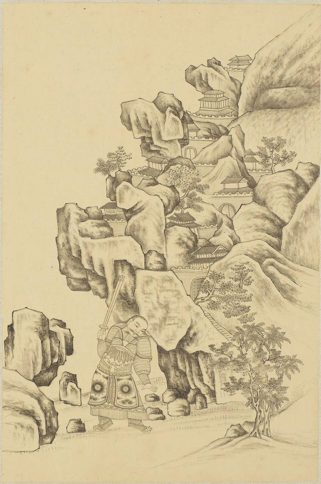 增城是昆仑山中的一处仙境,最早见于屈原《天问》,据说增城有九重,清代门应兆《补绘离骚图》中有增城的图像,由九座城池组成,与山石穿插错让,形成了盆景式的层垒结构,山下站着的神将身形高大,更显得山体和城池的狭小局促,由人工模拟自然造化,故而留下了盆景的堆叠安排痕迹。换言之,想象仙境的图像作品,都难免会陷入盆景式的窘境。图中的增城大多被山石遮蔽,有三座城可以看到城门,多数只露出城楼,以及锯齿状的城墙垛口,是真正从“城”的字面意思出发,照搬了现实中的城池,这也是一种有趣的现象——对仙界的想象,总是离不开人间经验。