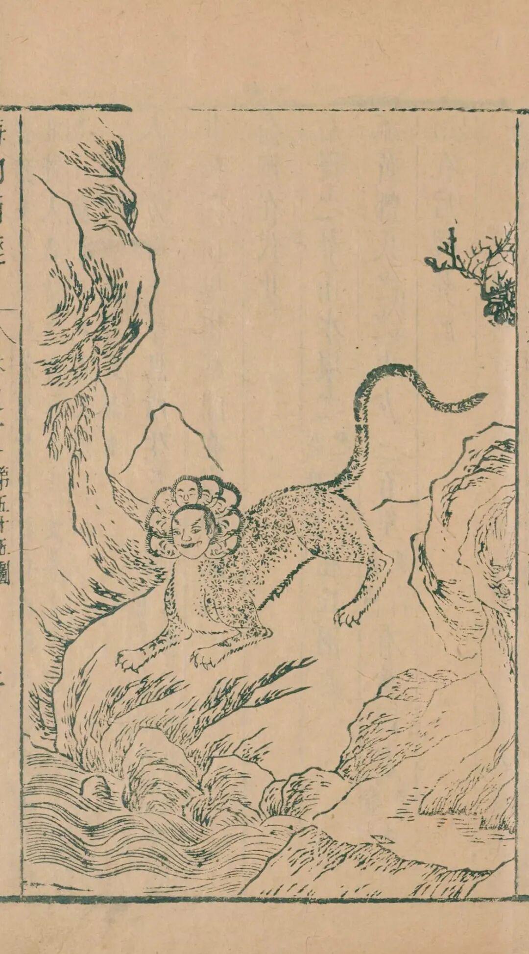 在明刊本《山海经》里,昆仑山的山石树木似乎与后来的《芥子园画谱》中的山水画并无二致,更像是从传统山水画里搬运出来的石块树枝素材,版框底部有大块的山石,一头怪兽踩在上面,再往下是滔滔流水,左侧和右侧也有悬崖耸立,还有一小部分树枝探入版框之内。三面包围的山石起到装饰点缀的作用,视觉的重心却是怪兽,昆仑山降到了配角的位置。这个怪兽名曰开明兽,是昆仑山的山神之一,日夜守护在昆仑山。郭璞《山海经图赞》:“开明天兽,禀兹金精。虎身人面,表此桀形,瞪视昆山,威慑百灵。”传说开明兽的九个脑袋分别盯着昆仑之丘的九门,只见它一颗大头居于中心,另外八颗头颅略小,环绕在大头周围,头上生出直而硬的短发,九头的面上皆有笑意,身子则是老虎的身子,布满了凌乱的毛发,利爪抓住山石,身后的长尾在空中挥舞。