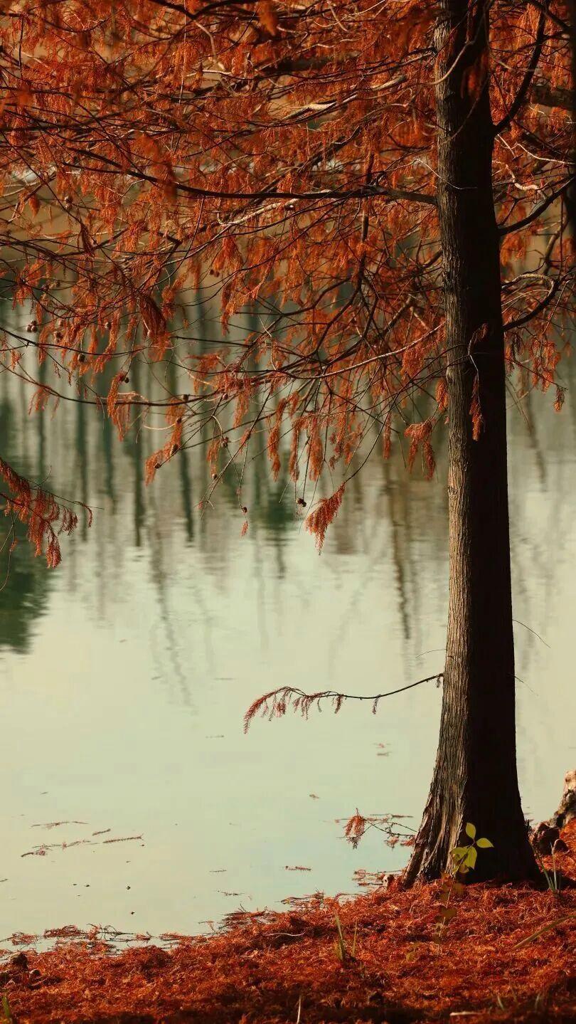 浅褐的树干、淡蓝的湖水