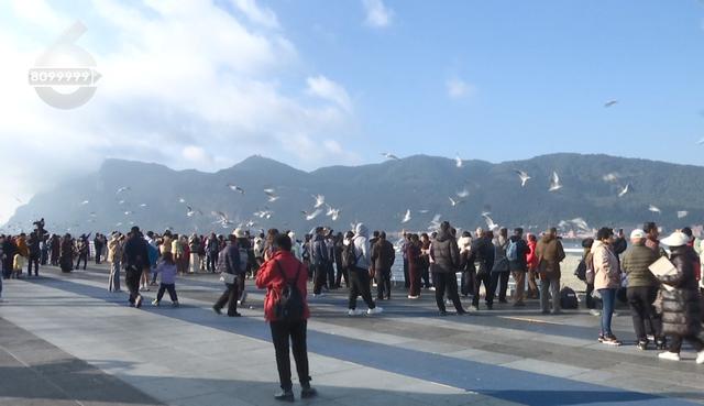 上午9点半,海埂大坝观鸥平台上已是人头攒动,前来观鸥、喂鸥的游客都满脸笑意充满了对红嘴鸥的喜爱。年轻人还没来得及购买鸥粮,就纷纷拿出手机、相机记录下这人鸥同乐的时刻,而中老年人则以体验为主,不 紧不慢的买来鸥粮等食物,一边投喂互动,一边拍下照片。