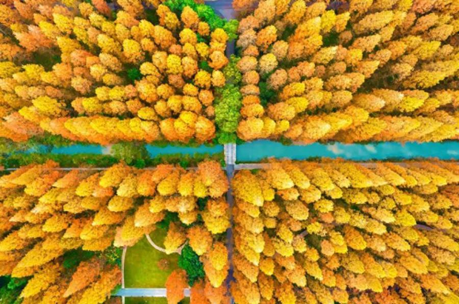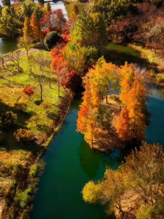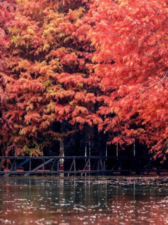入冬后,水杉叶色由绿色渐渐变金色,甚至成了火红的颜色。推着一辆自行车漫步在公园的水杉林中,红杉成林,湖光荡漾,眼前的树与水交相辉映,阳光打在杉林上,宛如大自然无意中打翻了调色盘,呈现出红、金、绿交织的绚丽色彩。