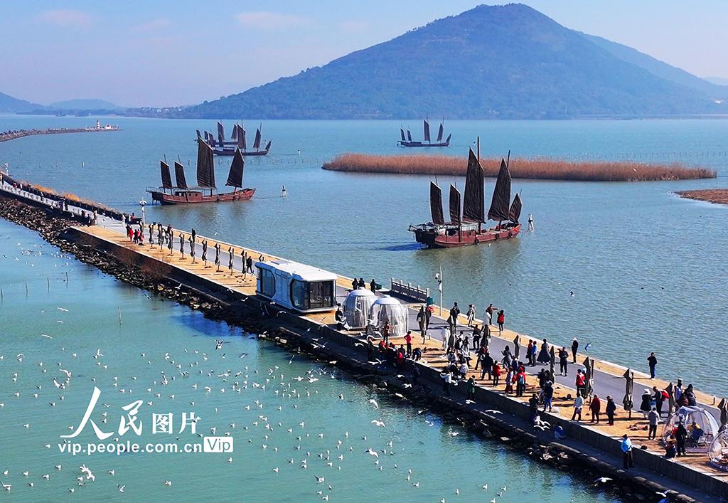 2026年1月14日,冬日暖阳中,大批红嘴鸥在江苏苏州吴中区光福镇太湖水域越冬觅食,翩跹飞舞,吸引众多游客前来赏鸥观景,人鸥相谐,构成一幅灵动的冬日生态图景。王建中摄(人民图片网)