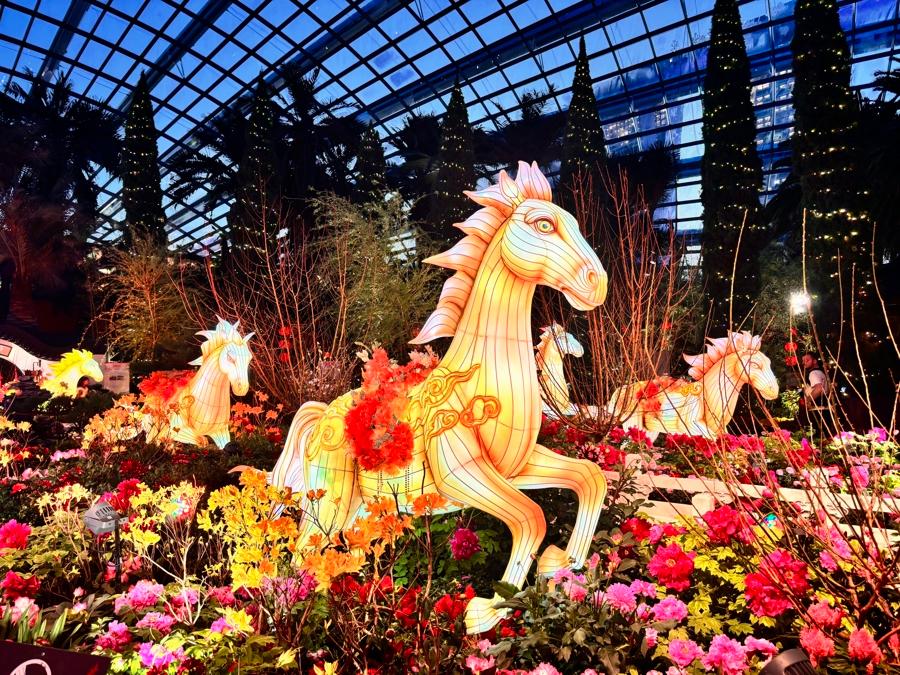 作为滨海湾花园的标志性春节花展,“春花盛开之骏马奔腾”将持续至3月1日,每晚7时亮灯。