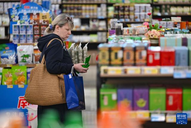 1月11日,外国游客在三亚一商场内购买茶叶。