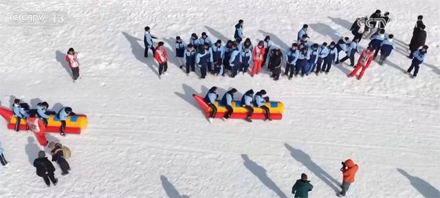 与此同时,冰雪趣味运动会也在火热进行中,雪地龙舟、雪地拔河等项目依次登场,300多名中小学生前来参加。