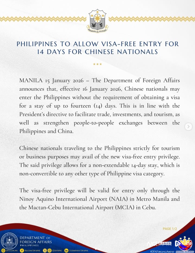 菲律宾外交部于1月15日宣布,自2026年1月16日起,将对持普通护照的中国公民实行免签政策,最长可停留14天。这是继俄罗斯等国后,又一新增的对华免签国家,预计将为持续火热的中国出境游市场注入新的活力。