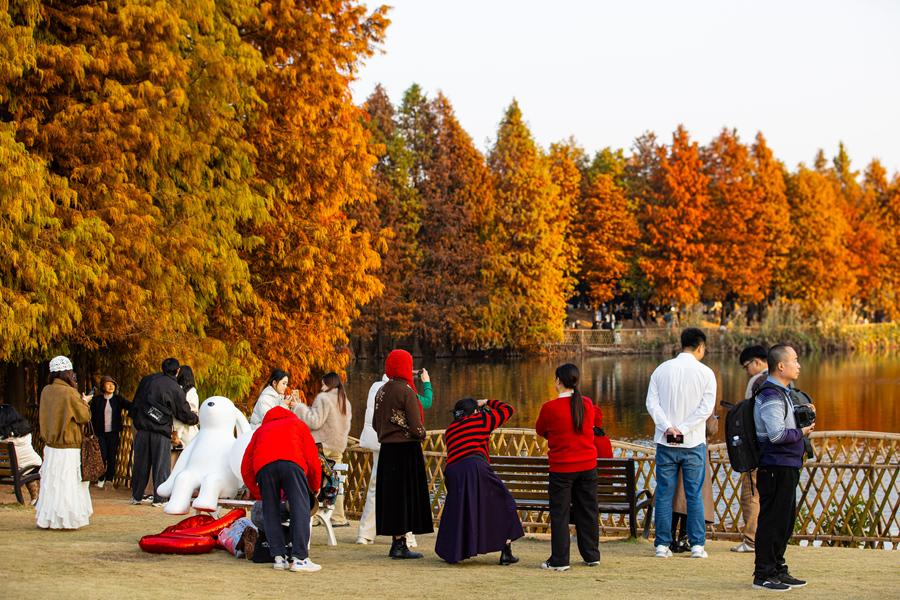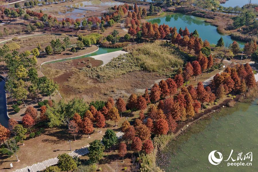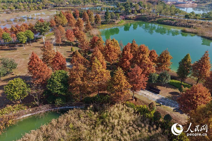 五彩缤纷的落羽杉犹如打翻的调色板,在大地上涂抹出靓丽的红。人民网记者 陈博摄